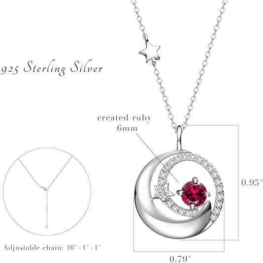 ❤July Birthstone Jewelry❤ This silver moon necklace with simulated ruby is an unique and heartfelt fashionable jewelry. You can make the birthday gift for your loved one. Ruby is the July Birthstone, Represents power and love. Known as the "Stone of Love", it also the stone given to celebrate the 40th wedding anniversary.